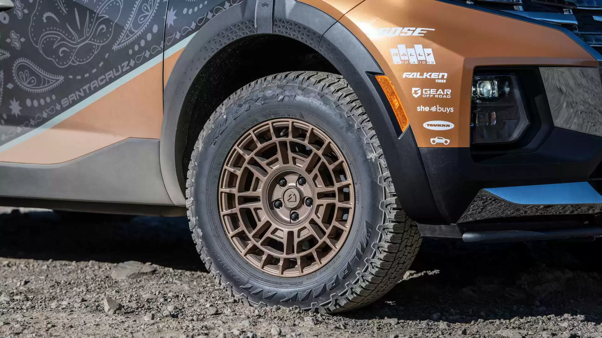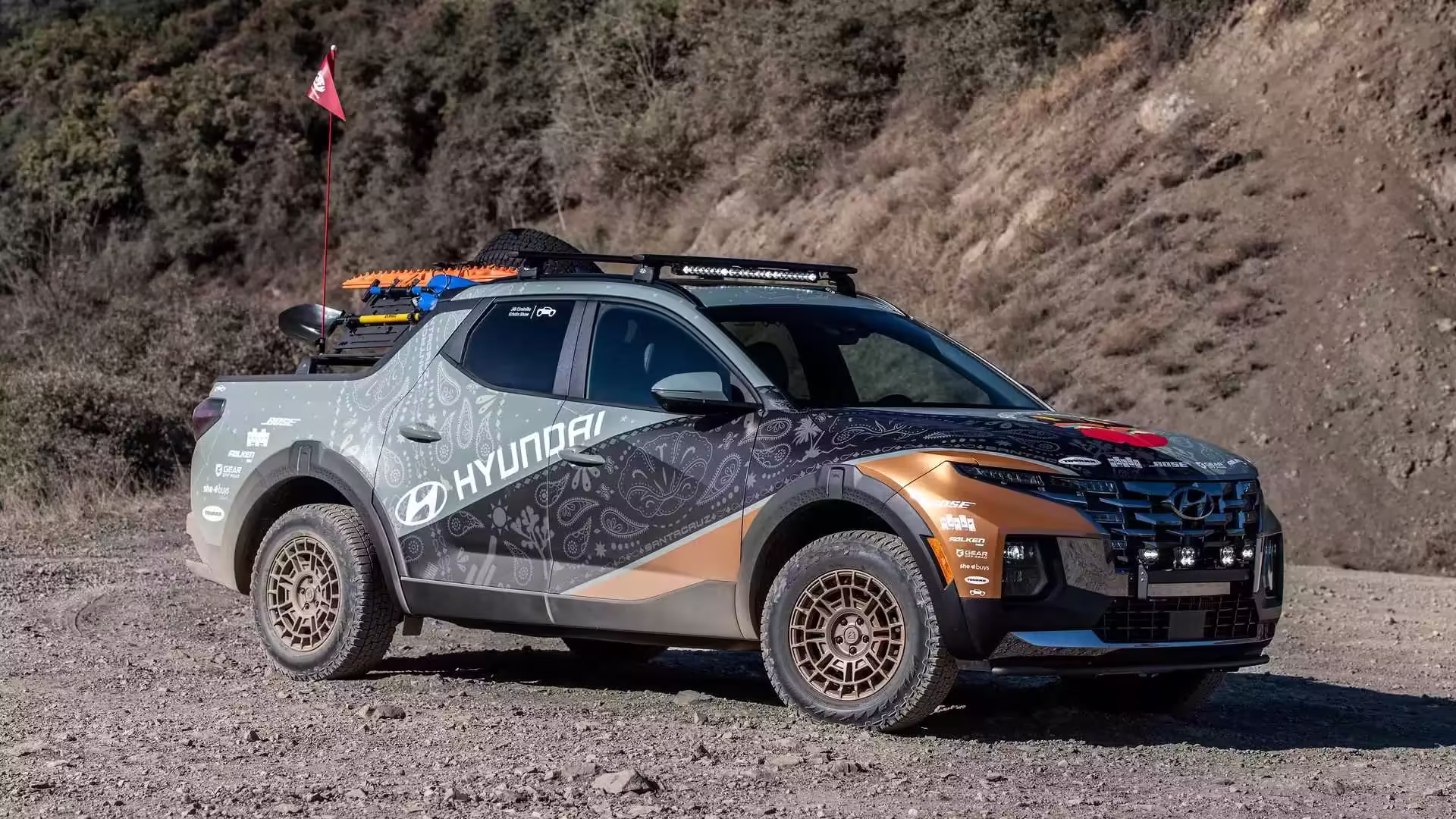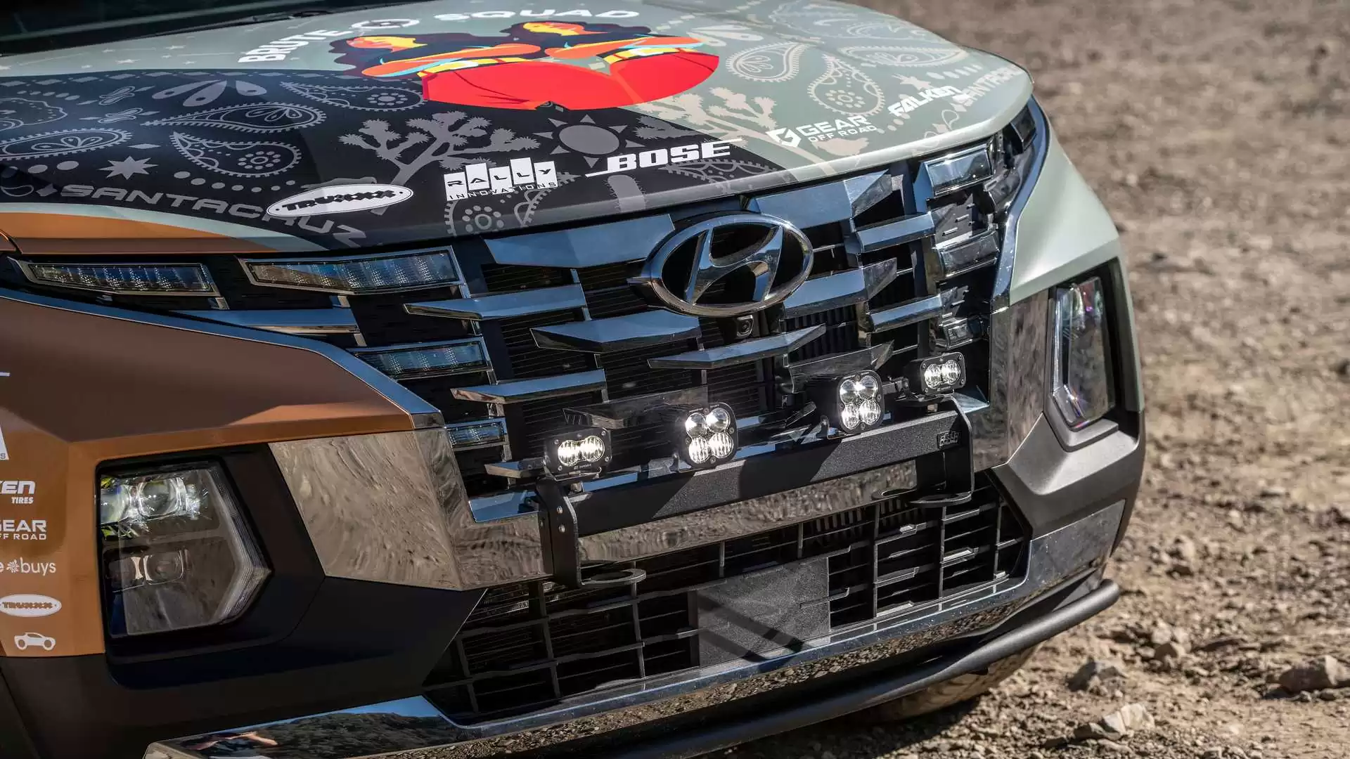 Un juego de neumáticos todoterreno Falken están montados en los engranajes, y en lo que respecta a la mecánica, eso es todo. La baca tiene una llanta de refacción, una rampa de rescate y un balde, y el techo y el parachoques delantero están equipados con luces de posición. Bajo la piel, Santa Cruz permanece intacto. Hyundai no mencionó un nivel de equipamiento específico, pero dada la situación, supongamos que es el SEL premium. Es la única versión que ofrece un cuatro cilindros turboalimentado de 2.5 litros que produce 281 caballos de fuerza (210 kilovatios) y 311 libras-pie (422 newton metros) de torque. También es la única forma de obtener una transmisión de doble embrague de ocho velocidades y tracción total estándar. Baje al Santa Cruz SEL y obtenga tracción total opcional, pero la única opción de motor es un molino de 2.5 litros de aspiración natural que genera 191 caballos de fuerza.